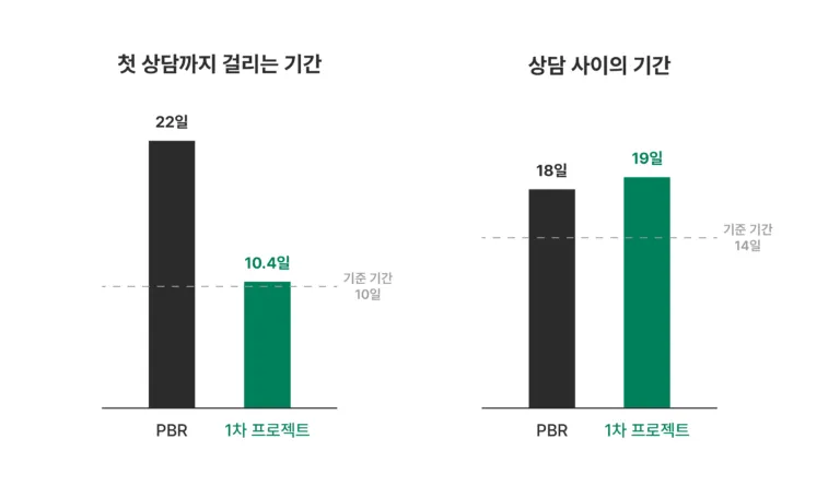 앞서 PBR에서는 첫 상담을 잡기까지 22일이 걸렸다. 그래서 1차 프로젝트에서는 전화가 아닌 온라인 예약 시스템을 도입해 예약 절차를 간소화하고, 담당자가 적극적으로 개입해 그 기간을 단축시키고자 했다.