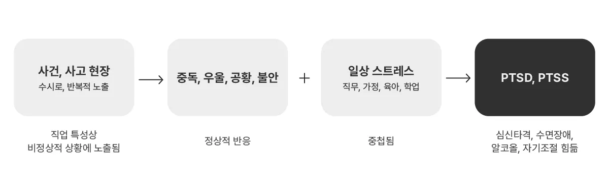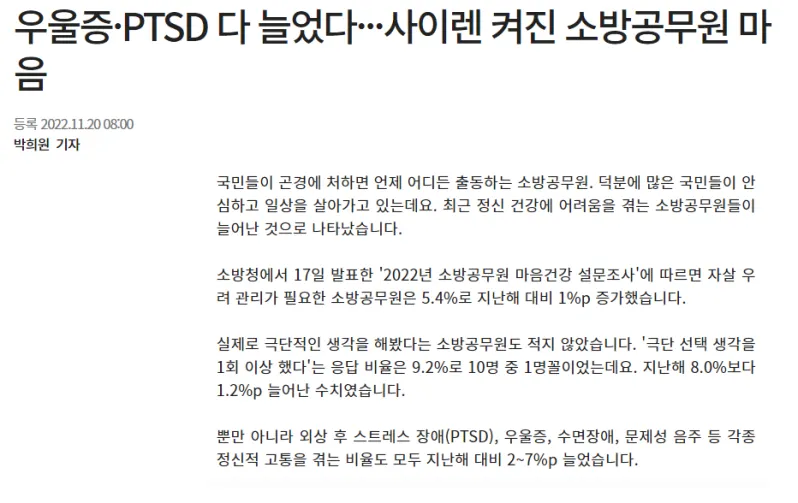 소방관은 힘들다. 일반 시민이라면 살면서 한 번 경험할까 말까한 참혹한 사고 현장을 숱하게 목격하고, 삶과 죽음의 경계를 넘나들기도 한다. 극도의 스트레스 상황을 자주 접하기에, PTSD* 유병률이 일반 시민에 비해 10배 가량 높은 것으로 알려져 있다.