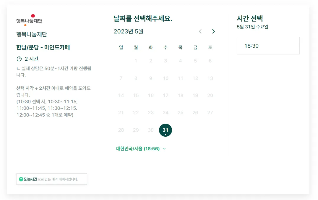 먼저, 별도 앱 설치나 회원가입이 필요하지 않는 서비스를 중심으로 알아보았고, 최종적으로 ‘되는 시간(바로가기)’이라는 서비스를 선택해 상담 예약 페이지를 만들었다. 그리고 상담센터와의 컨택과 일정 조율 같은 번거로운 절차는 프로젝트 담당 매니저가 맡았다.