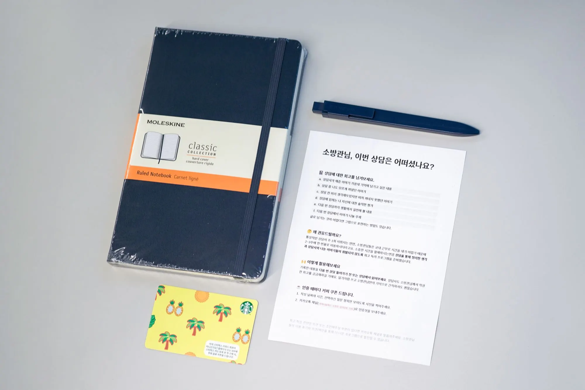 패키지는 노트와 펜, 커피 쿠폰, 가이드(질문지)로 구성되었다. 질문지를 보며 본인도 모르게 했던 이야기나 미처 하지 못했던 이야기를 떠올리거나 감정을 그림으로 표현하게 하는 등 상담을 상기할 수 있는 내용이라면 무엇이든 남길 수 있도록 설계했다.