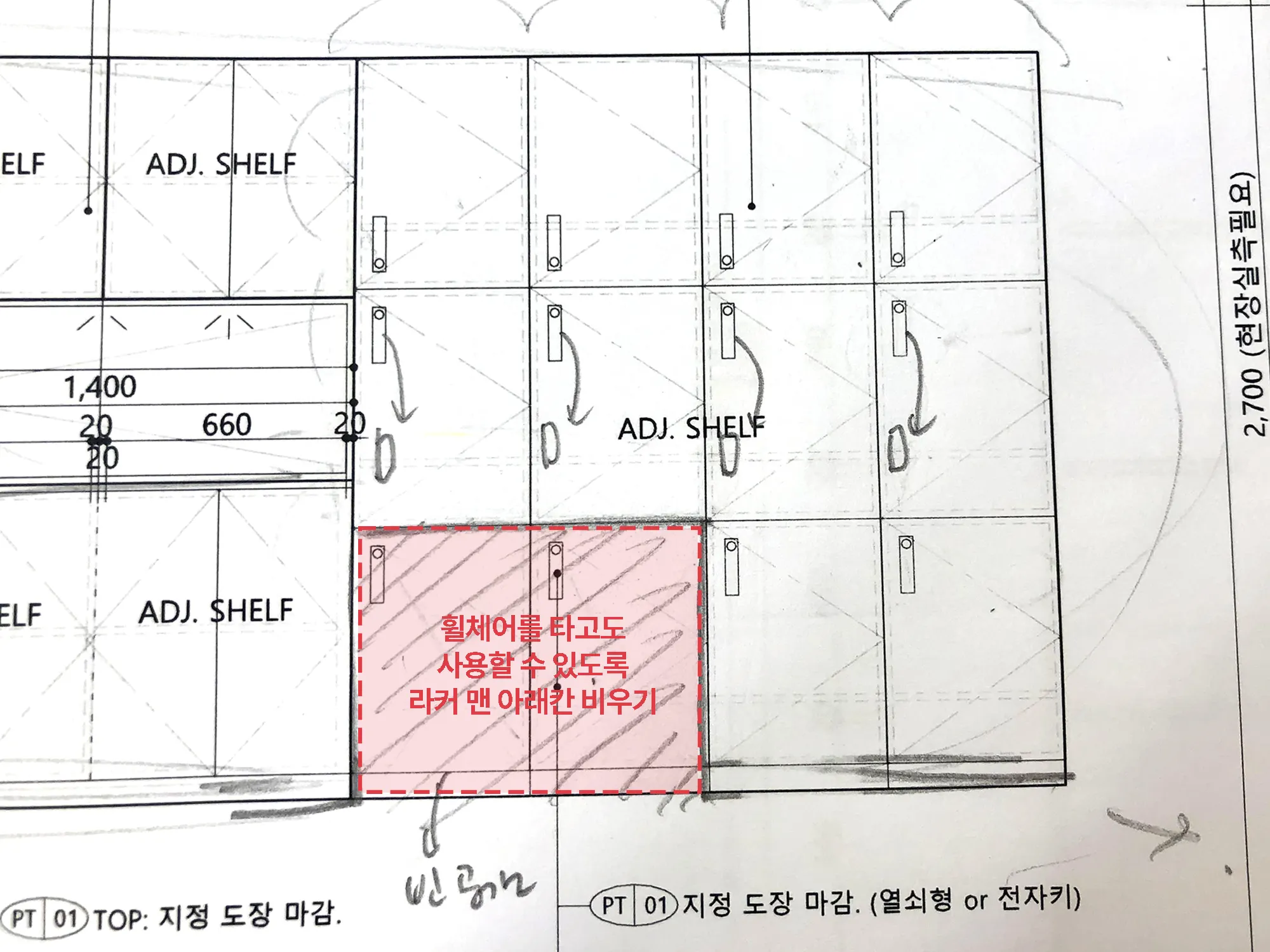 라커 : 휠체어를 타고도 사용에 불편함이 없도록 맨 아래 칸을 비워두는 형태를 생각했다.