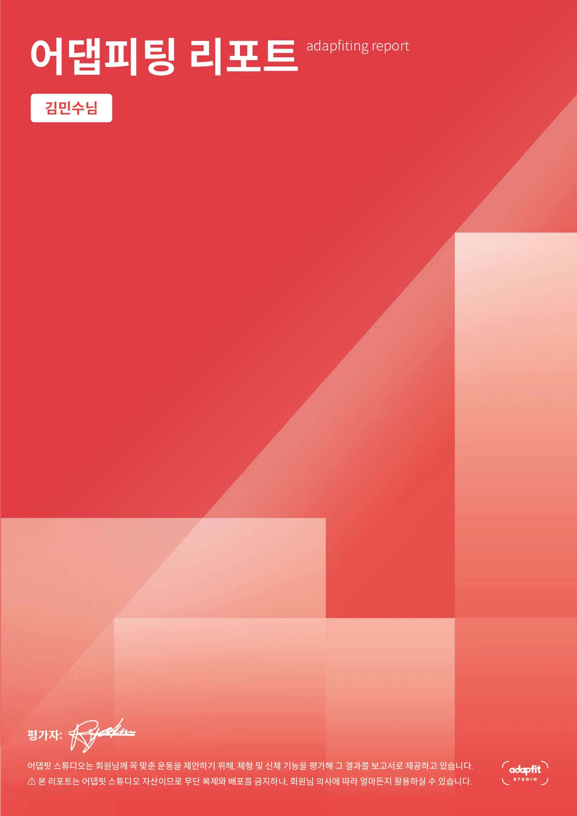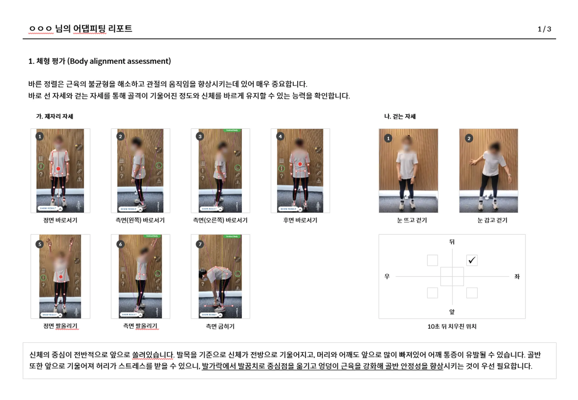 위와 같은 운동 프로그램은 모두 어댑피팅에 기반해 짜여진다. 마치 맞춤 옷을 제작하는 것처럼 체형/자세/신체기능을 종합적으로 평가해 그 결과를 보고서로 제공하며, 이를 바탕으로 고객 개개인에 최적화된 운동 커리큘럼을 제안한다.