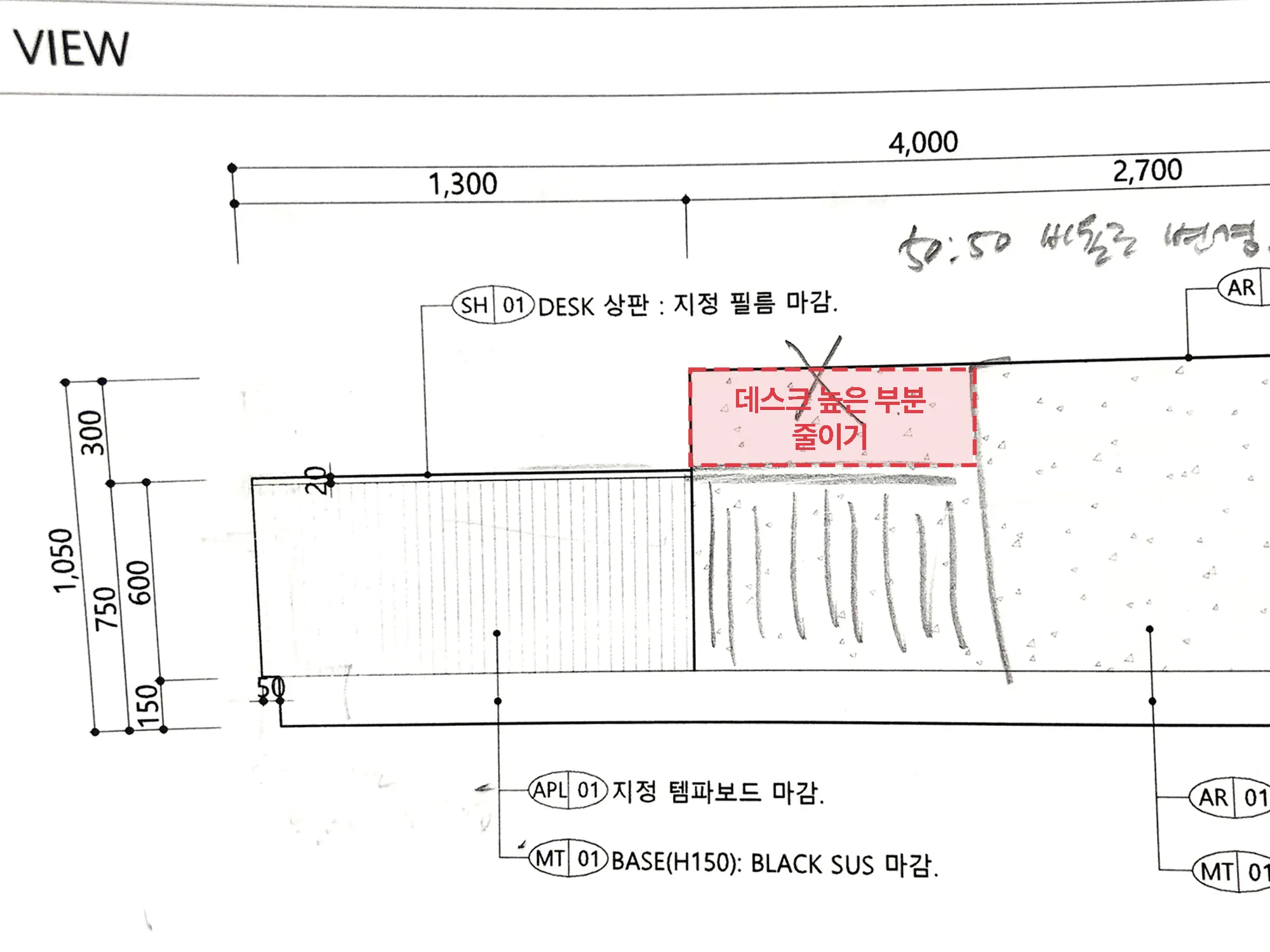 안내데스크 : 고객들이 처음으로 상담 받는 곳. 장애와 비장애를 동등하게 고려한다는 인상을 주고 싶었다. 그래서 데스크 높은 곳과 낮은 곳(주로 앉아서 상담하는 곳)의 면적을 동일하게 맞췄다. 또한 데스크에 휠체어가 들어갈 수 있도록 깊이를 40cm까지 확보하면서, 몸을 기대거나 해도 흔들리지 않도록 소재에도 신경을 썼다.