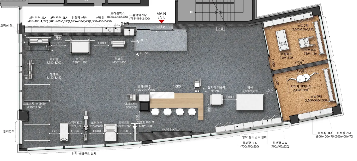 이러한 방향에 따라 새로 생길 장애 전문 헬스케어 센터의 공간은 그룹 운동 및 개인 운동을 위한 필드 공간과 퍼스널 트레이닝만을 위한 4평 남짓의 소규모 룸(2개), 크게 두 가지로 구성되었다.