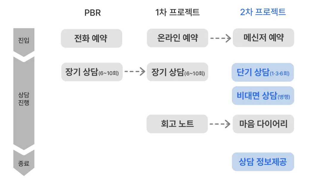 구체적으로는 1차 프로젝트에서 검증한 간편한 예약 방식과 회고 노트는 유지&발전시키되, 단기 상담, 비대면 상담, 상담 정보제공을 새로 시도해 보기로 했다.