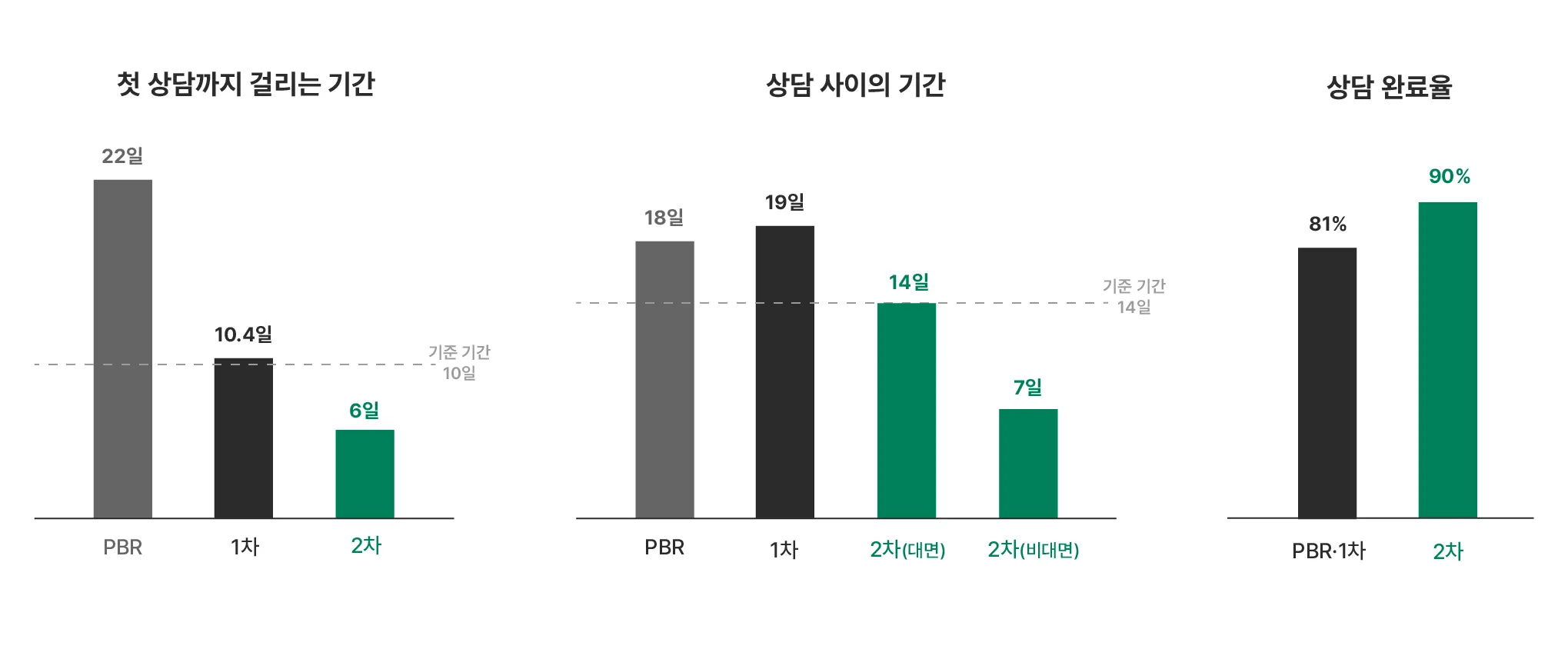 1차와 마찬가지로 2차 프로젝트에서도 첫 상담 기간 단축은 중요한 이슈였다. 상담 신청과 첫 상담 사이의 기간이 늘어지면 흐지부지 될 수 있기 때문이다.