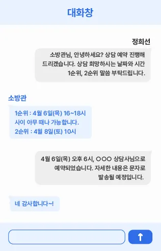 앞서 1차 프로젝트에서 상담예약을 간소화하면 상담 시작을 앞당기는 효과가 있다는 걸 확인한 바 있다. 이번에는 카카오톡 메신저로 예약 방법을 더 간편하게 바꿔보았다. 그렇게 하자 소방관-상담센터 간 일정을 바로바로 조율할 수 있었고, 빠르면 3일 내로 첫 상담이 이루어지기도 했다.
