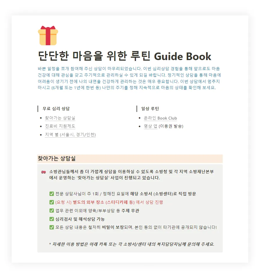 이 밖에도 비용 부담으로 외부 상담을 이용하지 못하는 소방관을 위해, 지자체 등에서 하는 무료 심리상담 지원 제도의 자격/시기/신청 절차 등을 상세히 정리해 제공했다.