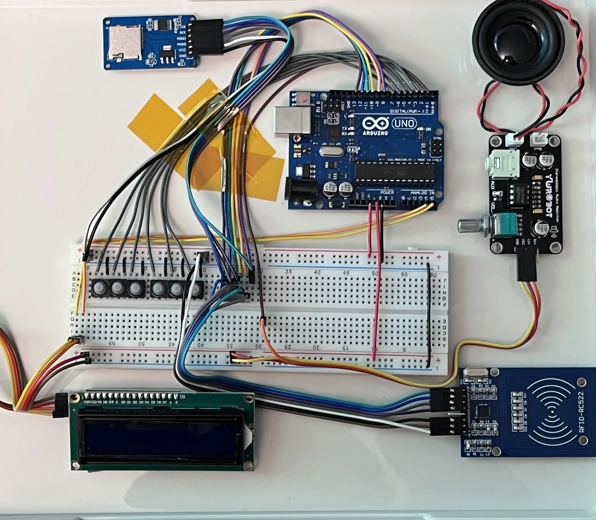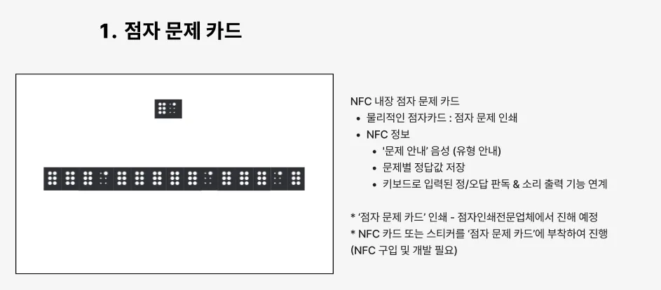 점자가 인쇄된 카드 형식으로 손끝 감각 자동 인지 연습지Fingertip memory sheet 문제지를 구현하고자 했다. 여기에는 RFID* 기술을 활용하고자 했는데 그 이유는 따로 기술 개발을 하지 않아도 되며, 연계 사용에 난이도가 높지 않기 때문이었다. 뿐만 아니라, 점자 문제 카드에 문제 정보를 인식시키고, 음성 안내를 출력하는 등 다양한 기능을 넣을 수 있었다. 또, 음성 안내를 위한 성우 목소리도 향후 테스트 이후 변동성을 고려하여 음성 소스 확보를 위해 성우 섭외 및 스튜디오 녹음 등의 과정을 거치지 않고, AI 오픈 소스를 활용했다.
