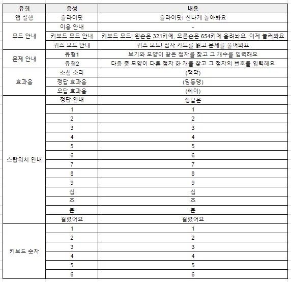 시각 장애 아동이 흥미를 지속적으로 유지하는 걸 돕고 청각적인 정보를 풍부하게 전달하기 위해 또래 아동의 음성으로 안내 음성을 촘촘하게 구성했다. 기기가 꺼지고 켜질 때마다 ‘안녕~’, ‘또 만나!’라는 음성이 나오며, 각 모드별 설명도 자세히 음성으로 안내한다. (’키보드 모드’ : 기기를 처음 키면 튜토리얼처럼 점자 키보드의 위치와 숫자를 알려주는 모드, ‘퀴즈 모드’ : 점자 문제 카드를 패드 위에 올려놓은 뒤 문제를 풀 수 있는 모드)