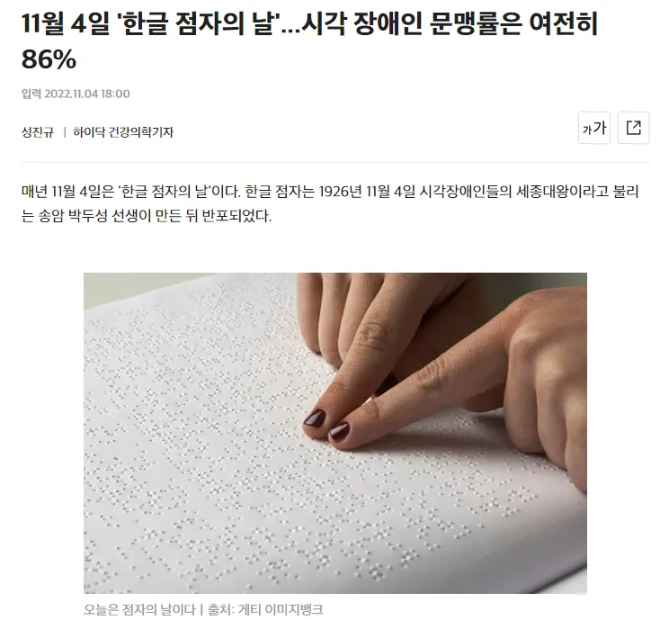 시각장애인이라고 점자를 자연스레 배우고 읽는 건 아니다. 점자를 잘 읽을 때까지 수도 없이 읽어야 한다. 더구나 한 글자만 읽는 게 아니라 단어, 문장, 글을 읽기 위해서는 더욱 그렇다. 연습을 많이 하면 된다고 하지만 시각장애인의 점자 문맹률은 여전히 높다. 우리가 만난 시각장애 학생과 학부모, 선생님들도 점자 배우리가 어렵다고 입을 모아 말했다.