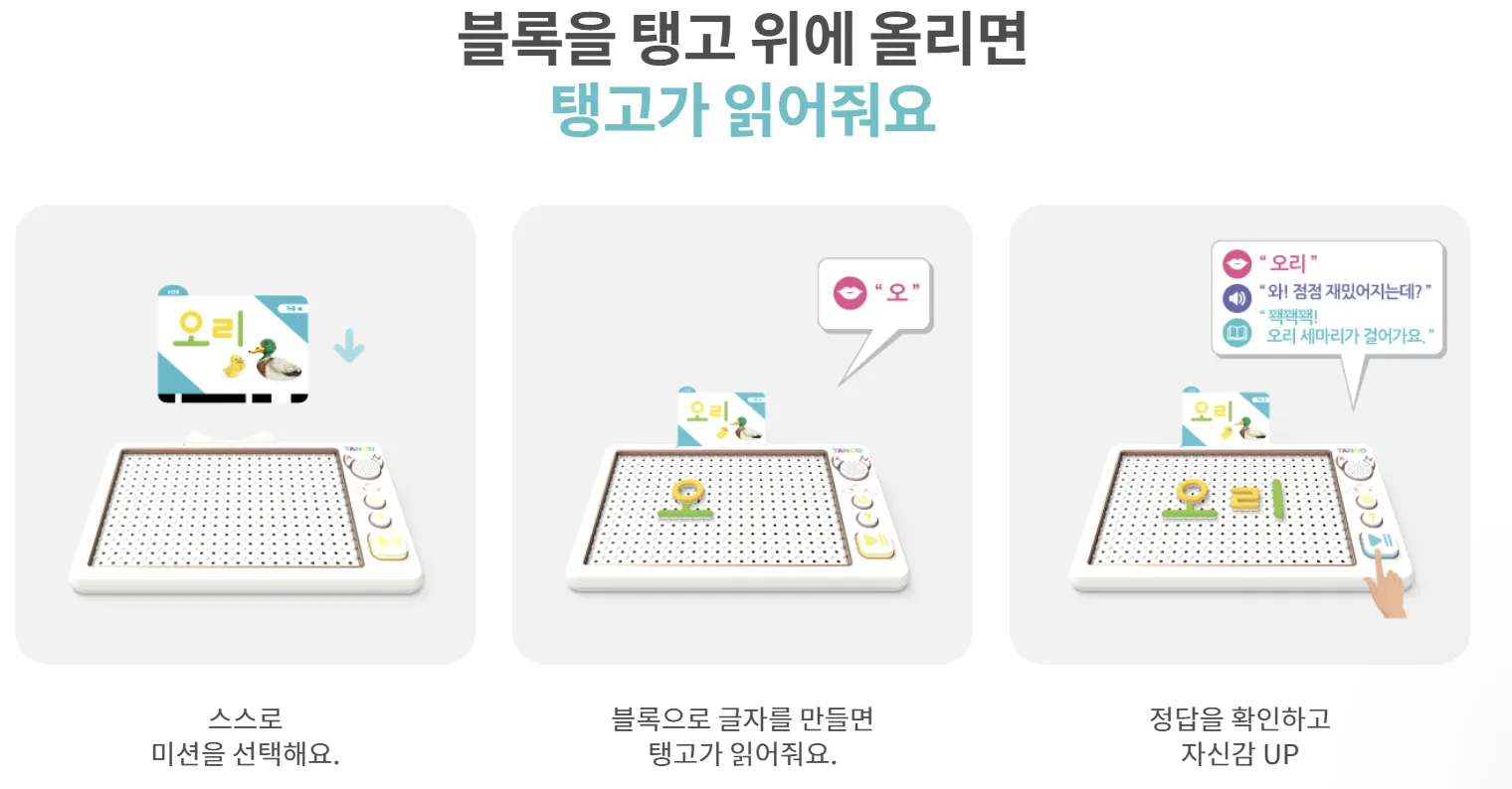 아이들은 어떻게 재미있게 학습할까? 먼저, 유심히 살펴 본 한글 학습 교구는 ①’(직접 선택하는) 문제 카드’와 ‘②행동에 대한 ‘즉각 반응 보상’을 제공했다. 아이가 스스로 문제 카드를 선택해 기기에 꽂은 뒤, 자음, 한글 블록을 기기에 놓으면, 기기가 읽고 칭찬해주며, 때론 조언도 해주도록 구현되어 있었다. 덕분에 아이들은 미션을 받고, 본인의 행동에 대한 반응과 보상을 느끼며, 학습을 놀이로 받아들여 한글을 즐겁게 익히는 듯 했다. 한편, 아동을 대상으로 한 기존의 점자 학습 기기 역시 한글 학습 교구와 유사하게 버튼과 재미있는 소리가 매칭하는 기능 등이 있었다. 이에, 곽예솔 매니저는 문제카드와 즉각 반응 보상, 이 두 요소를 교구에 포함하고자 했다.